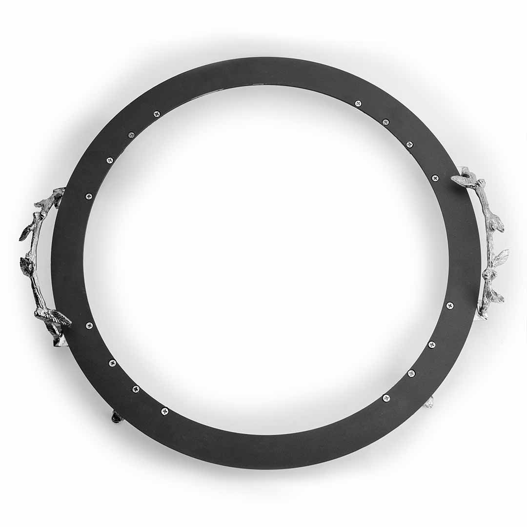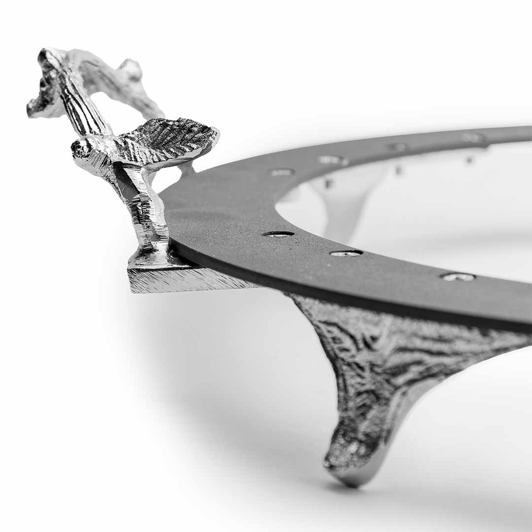 - Round stainless detachable flat trays on a circular frame with chrome-finished brass botanical-inspired handles and base.