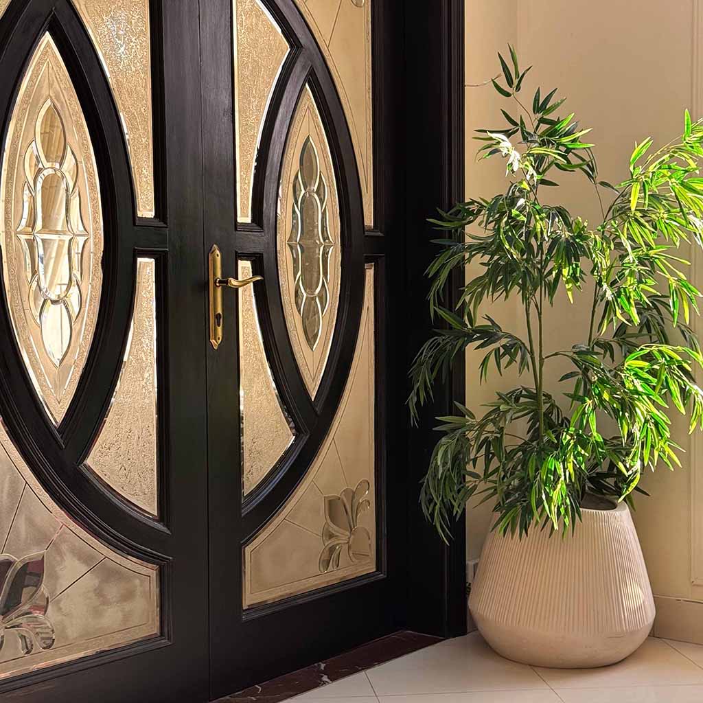 • Fiberglass planter with an inner pot