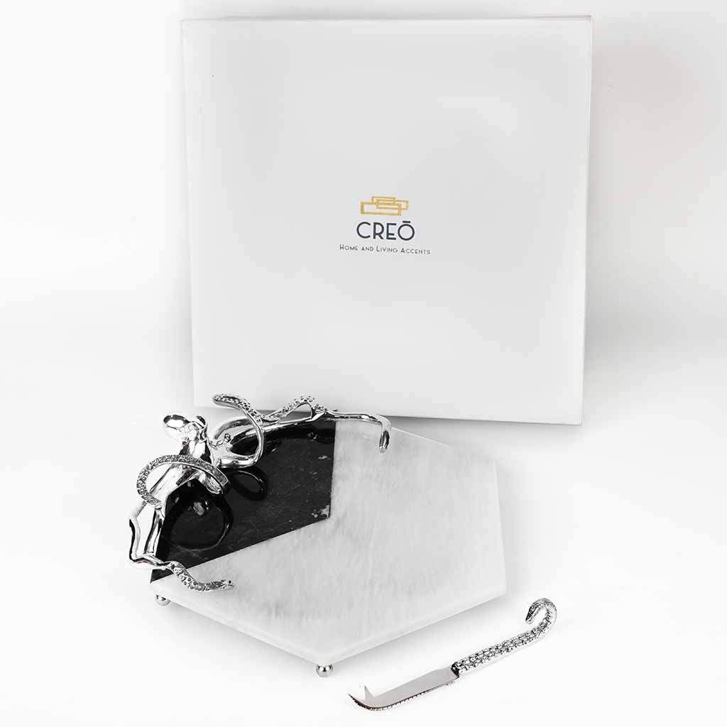 - Hexagon white and black marble tray with aluminum octopus and octopus tentacle knife.