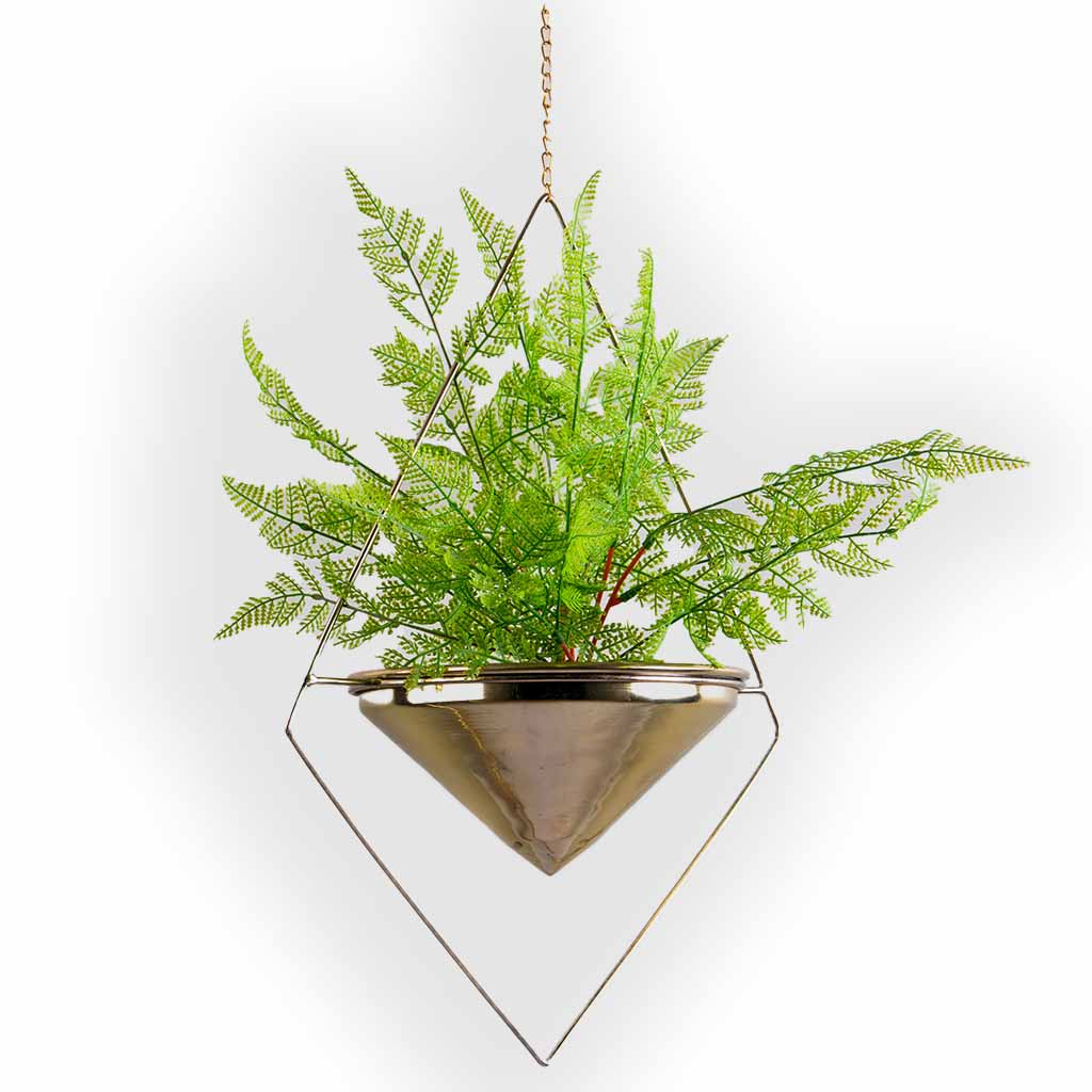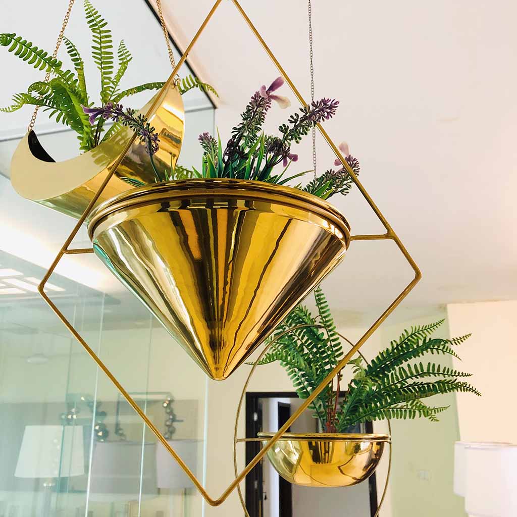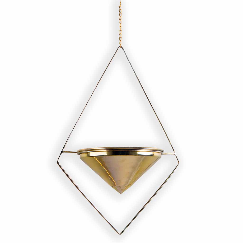 • Pyramid shape brass hanging planter.